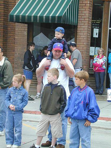 Watching the parade is alot of fun for kids and adults alike. Here Neil Hartzell holds nephew Aaron Tillema high enough not to miss anything, while Jessica Hartzell, Brad Hartzell, and Jake Snodgrass watch for the next entry ready to throw out candy.