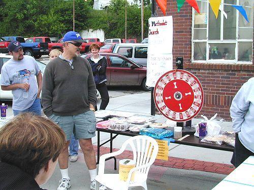 Pastor Paul Blanchard helps with the Louisville United Methodist Church booth, to help earn some money for the building fund. If you were lucky enough to have the wheel land on your number, you got to take home the baked good of your choice.