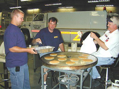 The Louisville Volunteer Fire Department started Louisville Daz off with a pancake feed. Guess it was a little too early for Bub Heard and Wayne Chriswisser, as they were sitting on their job as cooks. Aaron McClun (left) was busy going back and forth restocking the pancake supply.